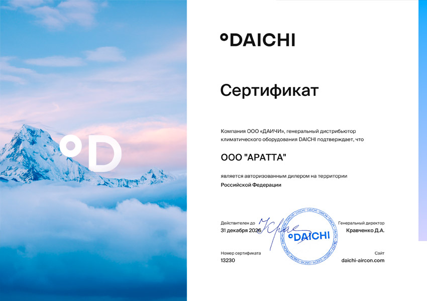 Компания "АРАТТА" является официальным дилером ведущих производителей кондиционеров и климатической техники. Мы работаем напрямую с брендами, минуя посредников, что подтверждается официальными сертификатами дилера, представленными ниже.